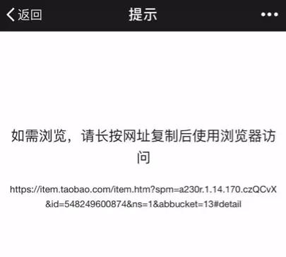 直到现在,淘宝商品的链接依然无法直接在微信打开,会弹出以下提示: