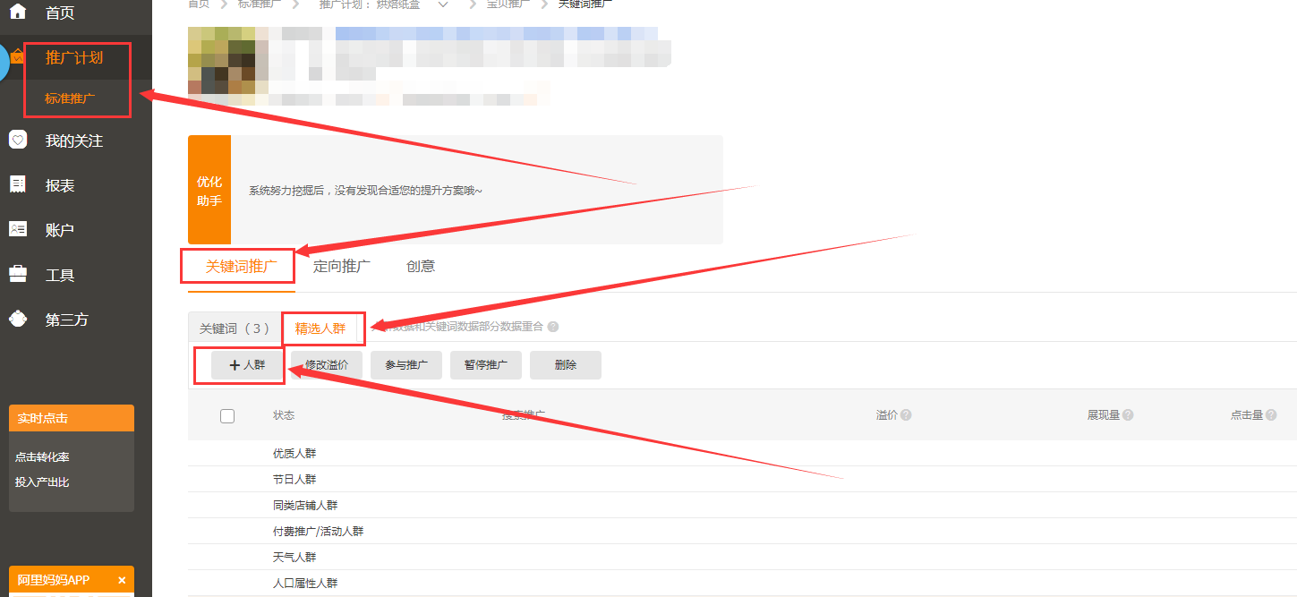 2.关键词推广下面精选人群,添加人群。添加访客人群,选择人口属性人群,根据上面自己生意参谋的访客分析来设置类目比单价,性别,年龄和月均消费额度。调整溢价,保留30%的利润,根据行业情况设置溢价。