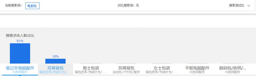 关于图3中电脑包这个,说实话我在刚做淘宝的时候也犯过错,因为潜意识里面就觉得他是在双肩背包里面的,但是真的当我做了一段时间以后,才发现了问题所在,因为类目不对,应该放在3C数码下面的笔记本电脑配件里面才对,他的搜索占比达81%。